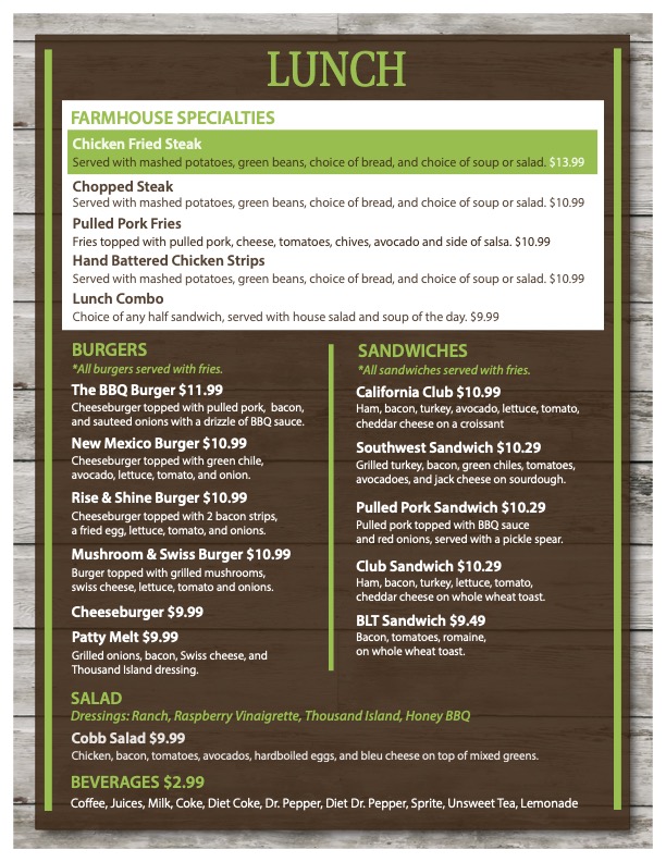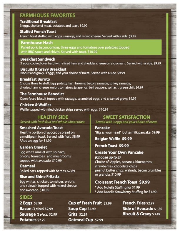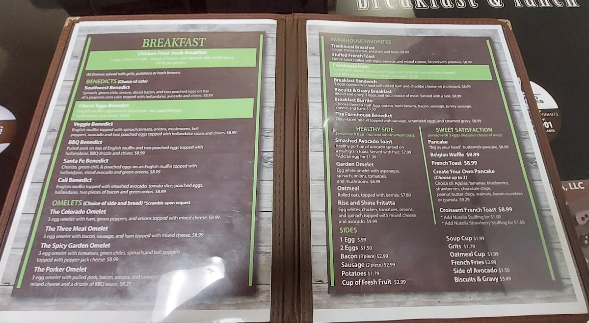 The Farmhouse Restaurant in Lubbock, TX, shines as a beloved spot for breakfast, brunch, and lunch. Their menu strikes a perfect balance between hearty comfort food and inventive twists. The Farmhouse Specialties stand out—like the Chopped Steak paired with two sides and your choice of soup or salad, offering a filling and satisfying meal at an excellent value. The Pulled Pork Fries, topped with cheese, avocado, and fresh salsa, deliver a rich, flavorful experience that guests rave about.